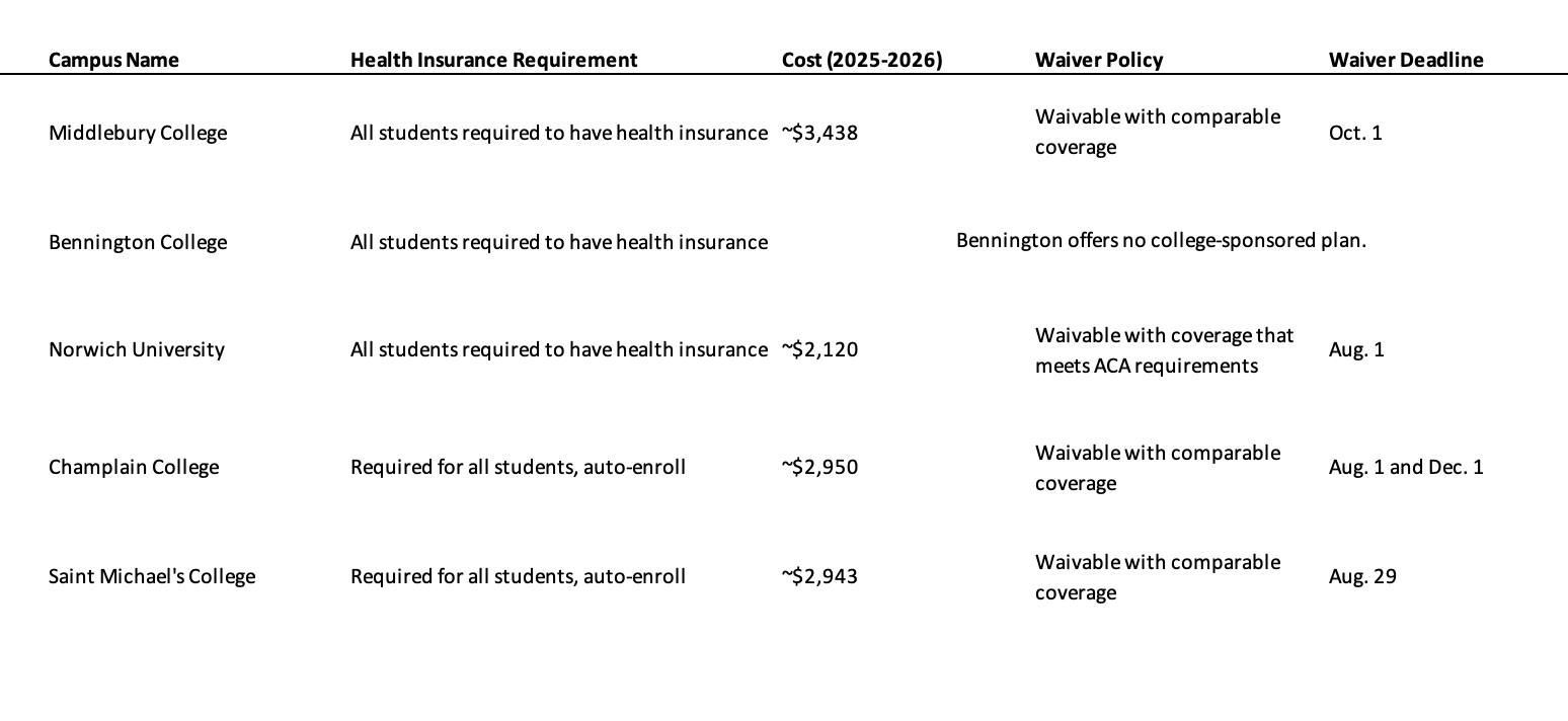 Vermont’s private colleges also impose broad health insurance mandates. Most require all students to carry coverage and automatically enroll those who do not submit proof of an outside plan.