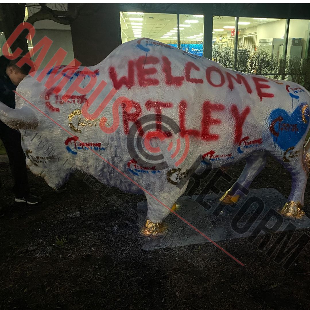 The painted bull, a UB tradition of painting a buffalo statue outside of the student center before sunrise, currently has a “WELCOME RILEY” message and is covered with TPUSA logos.
